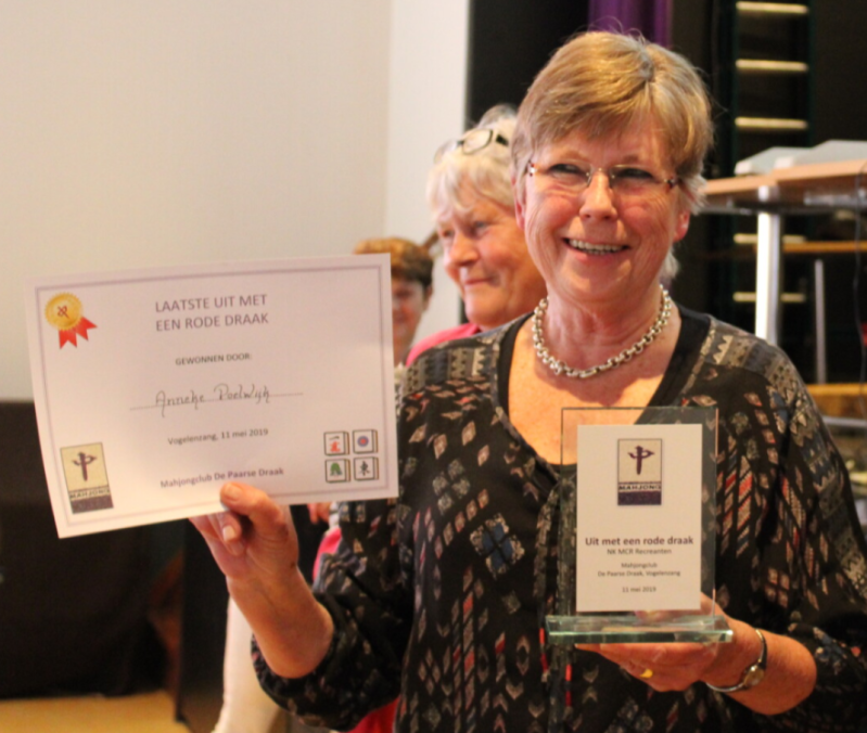 Nog harder dan voorheen, een vreugdekreet en gejubel. In de allerlaatste seconden werd een rode draak weggelegd en daar was hij: Anneke had de ‘Rode-draak’-mahjong! De blijde verbazing zorgde voor een breed applaus, wat perfect aansloot bij de daaropvolgende gongklank en zo het einde van dit toernooi officieel maakte, met de prijsuitreiking als het logische gevolg.
